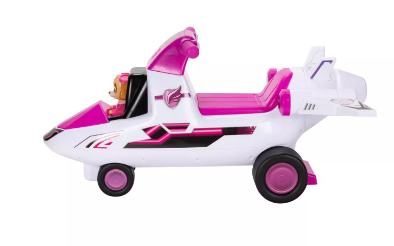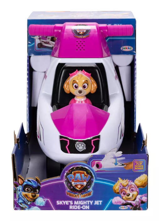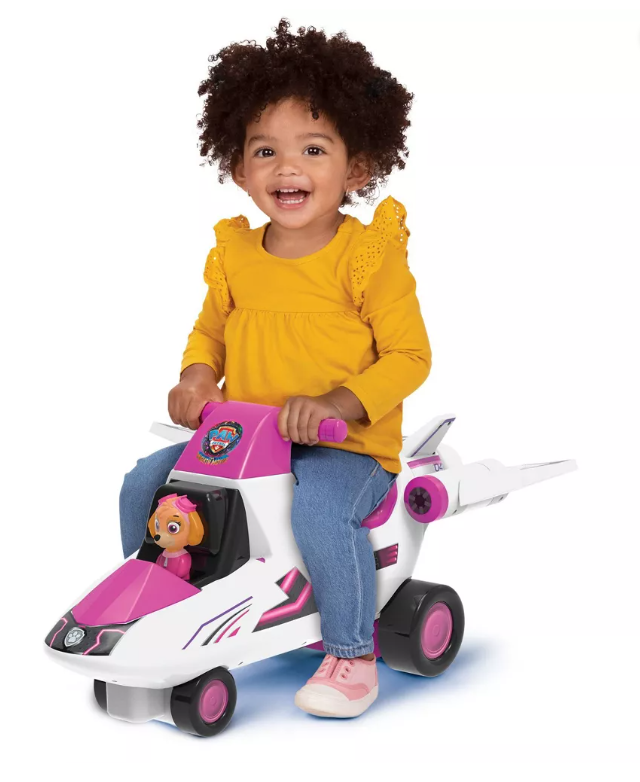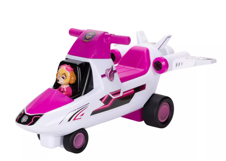 11545 - Vehículo para montar para niños con avión de combate Skye de la Patrulla Canina, luces, sonidos, espacio de almacenamiento y barra para caminar