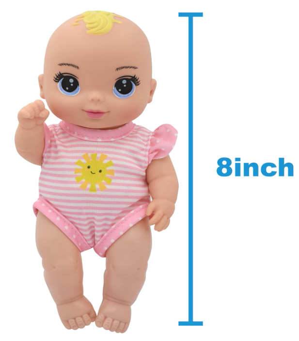 - ADORABLE 8" BABY DOLL: The set features a delightful 8-inch baby doll with a plastic body, designed to be durable. Dressed in a cute pink and white striped onesie, the doll is perfectly sized for little hands.