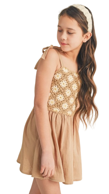 VESTIDO MINI DE CROCHET CON LAZOS EN LOS HOMBROS Y BORDES FESTOLEADOS ROPA PARA ADOLESCENTES, TOPS, ROPA PARA NIÑOS, ROPA PARA NIÑAS, NIÑOS, PRIMAVERA, VERANO
