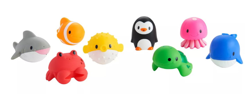 This set of eight colorful ocean squirts is guaranteed to keep bath boredom at bay! With the Ocean buddies, your little one can create stories of deep water fun while learning animal names like pufferfish, penguin, jellyfish, and more. Each brightly-colored bath toy floats, squirts water, and is sized just right for little hands to grasp and squeeze. The clear canister provides easy storage and makes it a great baby or toddler gift, too! Introduce all eight toys at once for an exciting ocean adventure, or surprise your little diver with a new bath friend each day. Either way, bathtime is sure to go swimmingly!