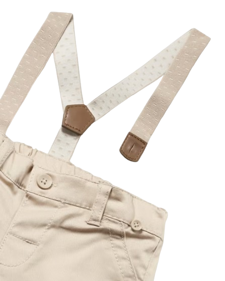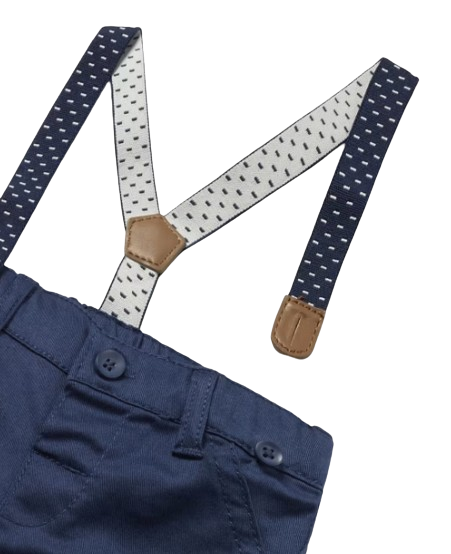 Pants for newborn. Elasticated waistband with button fastening. Design with mock pockets on the front and functional on the back.