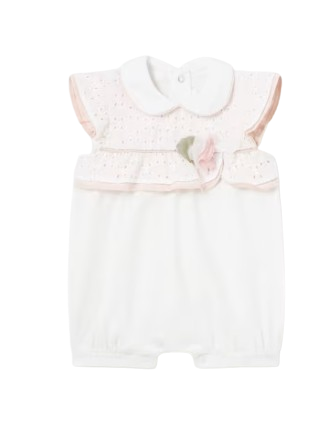 Short sleeved Sleepsuits for newborn. Back snap closure. Snap button closure at crotch for easy putting on and taking off. Decorative elements: floral applique.