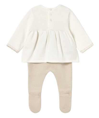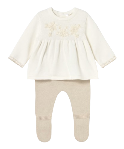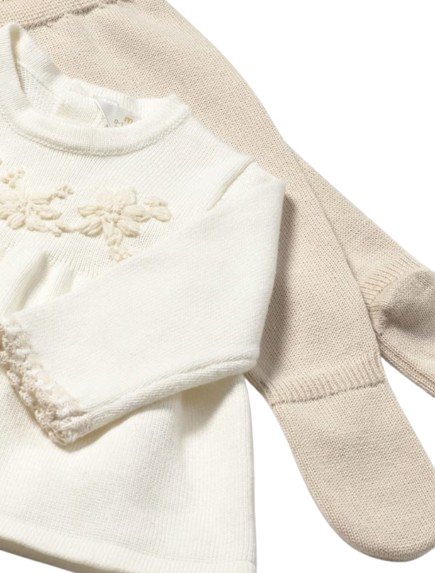 This two-piece tricot set for newborn baby girl includes a sweater with matching leggings.