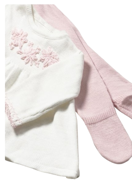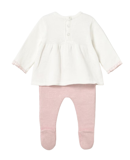 This two-piece tricot set for newborn baby girl includes a sweater with matching leggings.