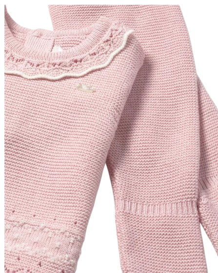 Long sleeved Sweater for newborn baby girl. Button fastenings down the back to allow the garment to be put on and taken off easily.