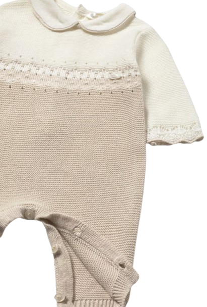 Long sleeved One-Piece for newborn baby girl. Snap button fastening at crotch for easy dressing. Button fastenings down the back to allow the garment to be put on and taken off easily. Knitted fabric, soft and pleasant to the touch. Decorative elements: openwork details. For this item, the larger sizes (from 6-9 months to 18 months) will not have feet. This is to allow better mobility and more comfort.