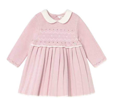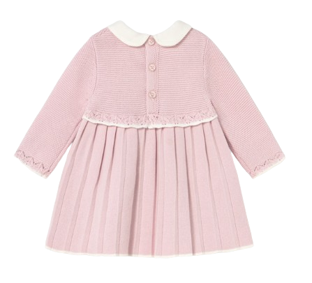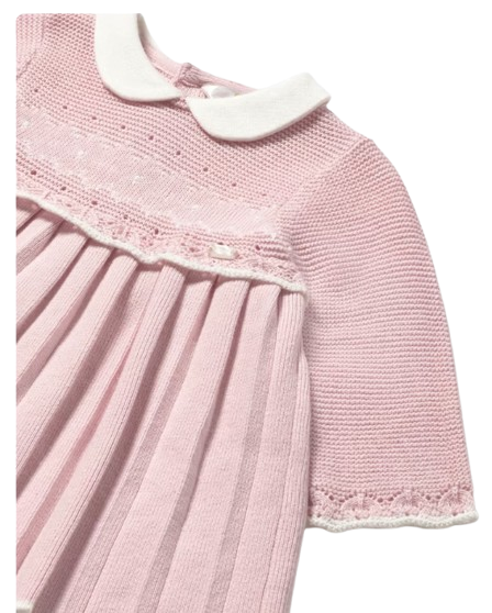 Long sleeved Dress for newborn baby girl. Baby neck. Button fastenings down the back to allow the garment to be put on and taken off easily. Knitted fabric, soft and pleasant to the touch. Pleated design. Jacquard stitch designs.
