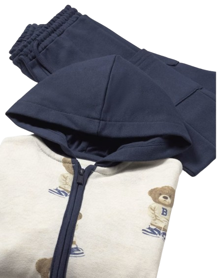 Three piece tracksuit for baby made up of a sweatshirt, and two pairs of joggings bottoms.