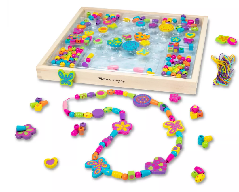 This deluxe beading set is a jewelry designer's dream! The Melissa & Doug Bead Bouquet jewelry making set is an easy-to-use arts and crafts kit for designing and stringing necklaces and more. The wooden sorting tray comes stocked with eight multicolored cords that can be cut to any size so kids can make a necklace, bracelet, or anklet. The kids' jewelry making set includes 220 handcrafted wooden beads in the shape of hearts, flowers, and butterflies, with an array of lovely design details. Everything comes in a sturdy, wooden tray making clean up and storage a breeze. Constructed of high-quality, durable wood, it's a perfect stringing, patterning, and designing activity for budding designers. It's also a great way for kids to practice hand-eye coordination, fine motor skills, pattern recognition, and creative expression. The Created by Me jewelry making set makes a great gift for kids ages four and older for hands-on, screen-free play. This product is certified by the Forest Stewardship Council. FSC certification ensures that products come from responsibly managed forests that provide environmental, social, and economic benefits, and that forests are protected for future generations.