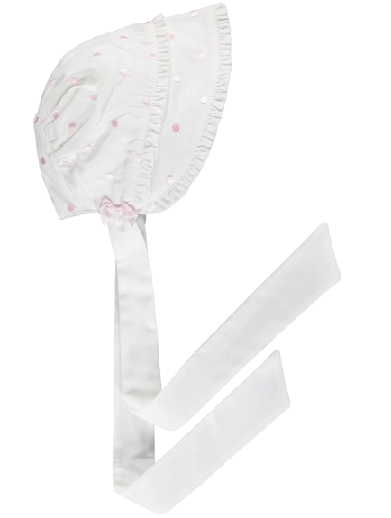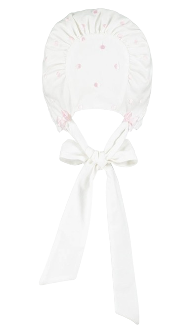 This baby girls adorable white bonnet with pale pink embroidered polka dots has two tiers of delicate ruffles adorning the front. Two perfectly tied pink satin bows sit just above the brushed cotton ties. The bonnet is fully lined and ties under at the front with soft cotton.