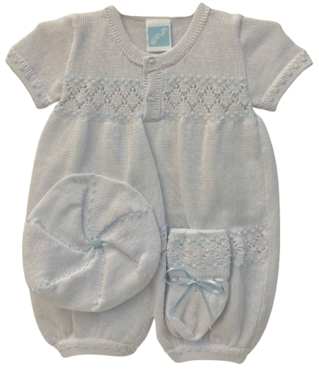 Knitted 3 pcs romper set. Comes with hat and booties. Poly cotton.