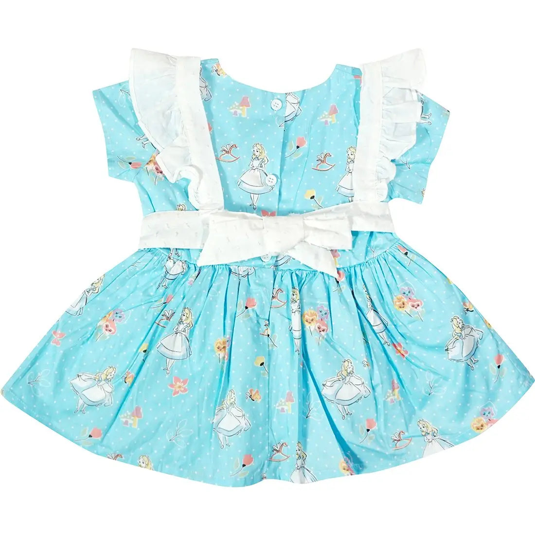 True to size. This dreamy retro-style dress showcases Alice's topsy-turvy world. Patterned with Alice In Wonderland all over printing on polka dot pattern, this short-sleeved cotton dress is accented by a swiss dots apron with delicate ruffle detail and trimmed at the waist. Buttons back closure. Apron is detachable. 100% cotton from Korea, USA, or Vietnam. Soft and comfortable for all day wear. Hand wash cold. Lay flat to dry. Do NOT bleach. Best gift for girls on Back To School, Birthday Party, Halloween Costume Competition,.. or special events.