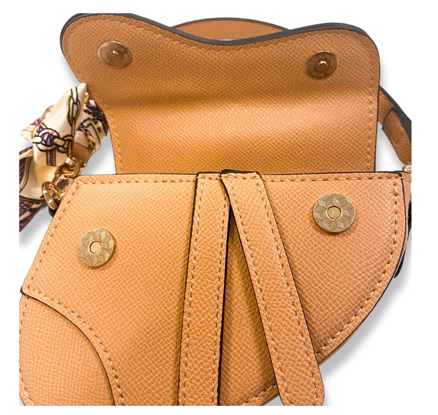 This classic saddle style is finished with a tied scarf and includes a detachable golden chain. The perfect purse for you to match with your mini me!