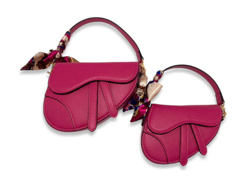 This classic saddle style is finished with a tied scarf and includes a detachable golden chain. The perfect purse for you to match with your mini me!