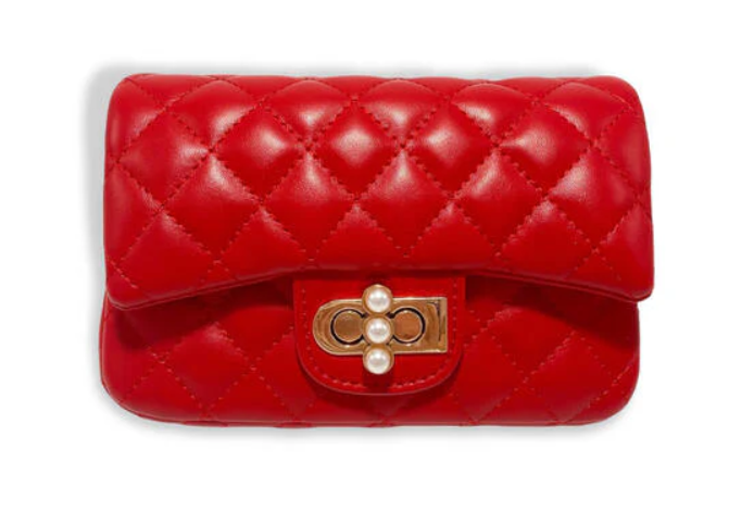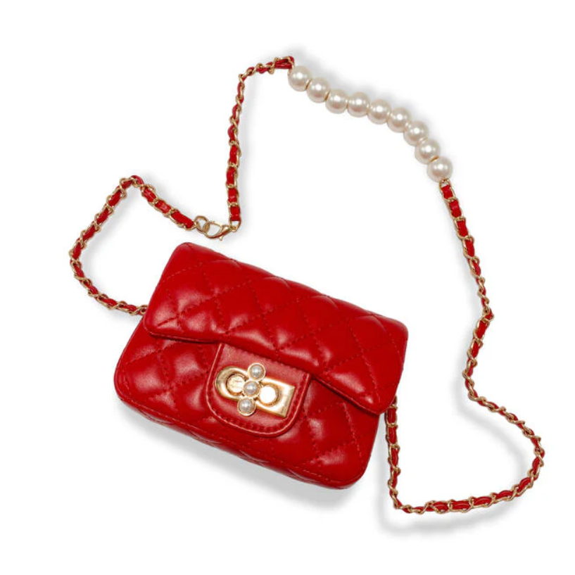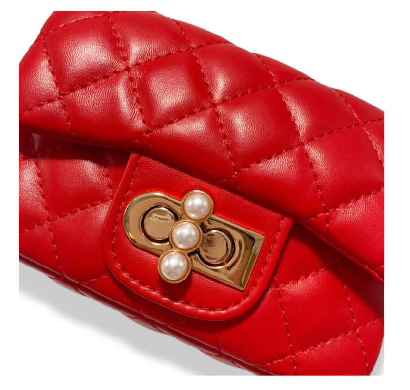 What a gorgeous pink bag! This classic quilted purse is finished with a golden clasp and pearl charm. It includes a detachable golden chain as well. The perfect bag for you to match with your mini me!