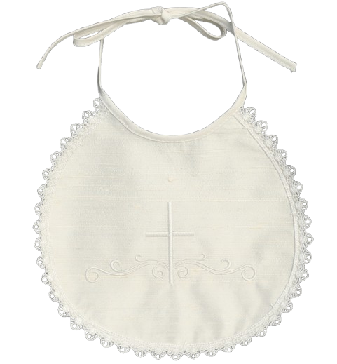 BB34 - Raw Silk Bib with Embroidered Cross & Lace Trim