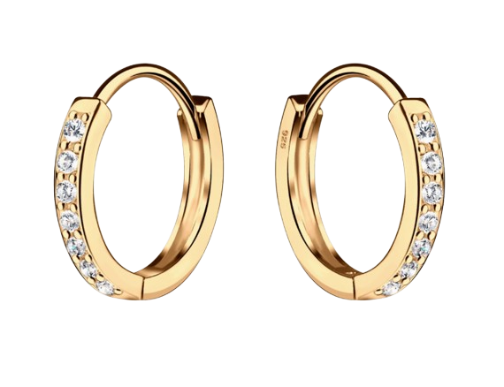 NEW! 14K Gold-Plate (over sterling silver) huggie earrings with sparkling CZs. Nice click closure for children, kids, toddlers, and little girls. These earrings are made with precious metals that are hypoallergenic and nickel free and should not irritate sensitive ears. Sizing: 10mm for babies and kids