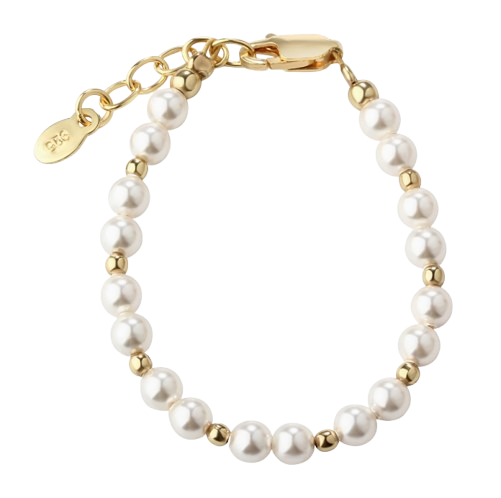 This keepsake bracelet is made with genuine soft white high-end Austrian simulated pearls accented with 14K Gold-plated beads! This is a high quality bracelet in sterling silver with 14K gold plating. Each bracelet has an extension chain, so as the child grows you just move to the next link for a perfect fit. This bracelet is available in three sizes and is great for infants, babies, toddlers, and kids and comes in a beautiful gift box. Hand made in the USA!