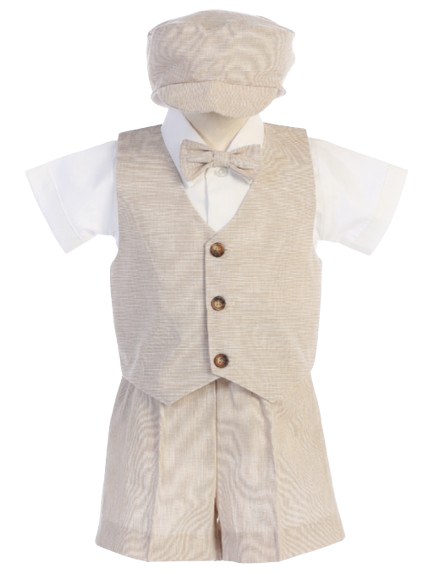 - 45% Cotton / 55% Linen vest and shorts with matching hat and bowtie