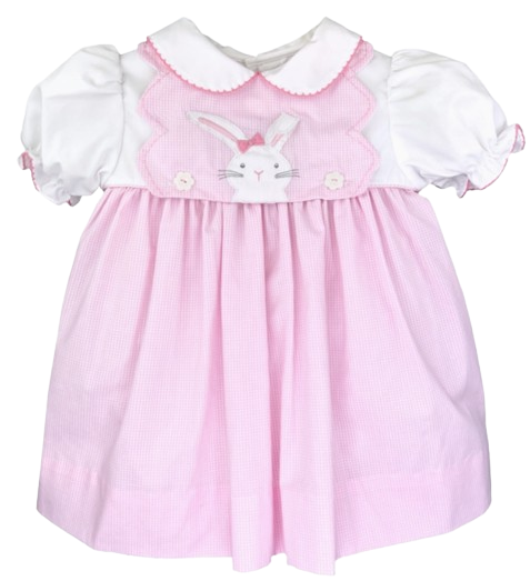 Nothing beats two outfits in one! This dress features a removeable Easter bunny applique bib with a dog applique underneath, giving you a whole second dress! Our Easter Dress with removable bib features an Easter bunny applique on the bib which then can be buttoned off to reveal a dog applique underneath. This short sleeve dress comes in a soft pink check cotton-poly blend fabric that is light weight and machine washable for easy care.
