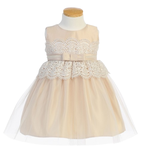 Baby girl dress with satin and tulle skirt. Features a wide lace trim with peplum detail at the waist, with a 1" satin ribbon going across, a satin bow & pearl trim. Satin back belt and zipper for closure.