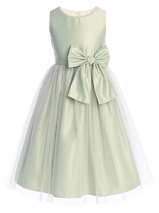 SKB781 - Sage Satin Tulle Pearl Ribbon Flower Girl Dress