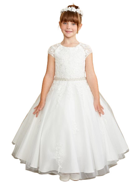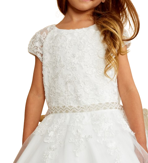 - Lace bodice with cap sleeves and sparkling rhinestone waist